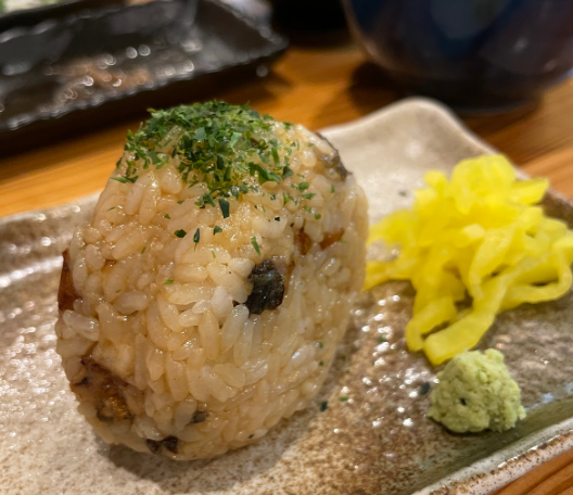 The course features a rice ball generously filled with high-quality unagi. The rich, savory glaze of the eel seeps into every grain of rice, creating a comforting yet luxurious bite. It is simple and quintessentially Hamamatsu.